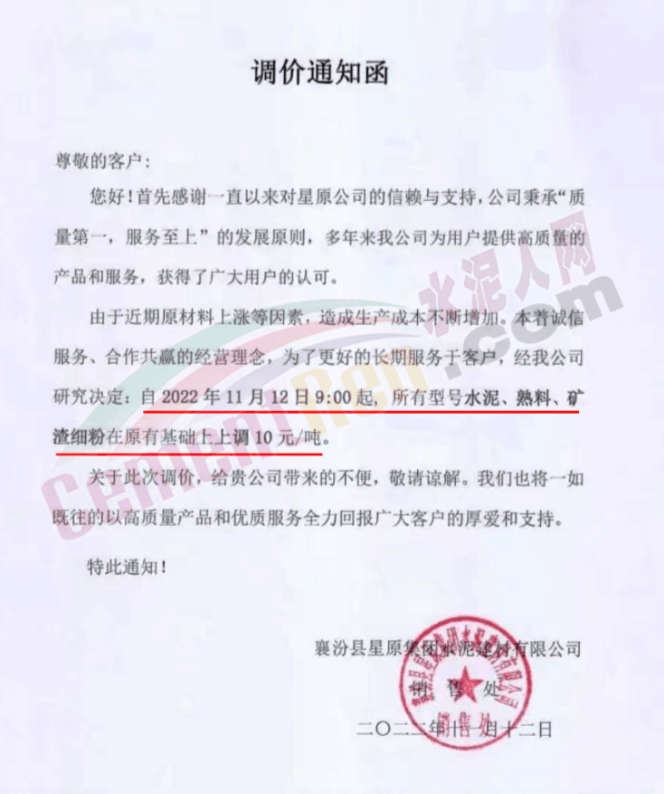 山西臨汾襄汾縣星原集陽水泥建材有限公司通知,由于近期原材料上漲等因素,造成生產成本不斷增加。經公司研究決定,自2022年11月12日9:00起,所有型號水泥、熟料、礦渣細粉在原有基礎上上調10元/噸。