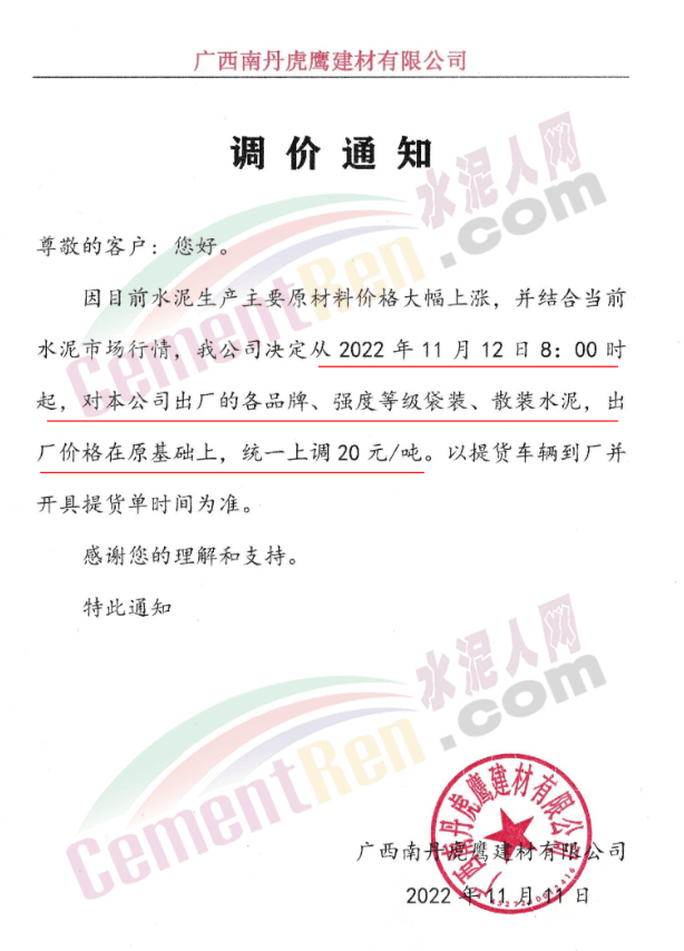 廣西壯族自治區(qū)河池市南丹縣廣西南丹虎鷹建材有限公司通知因目前水泥生產主要原材價格大幅上漲,并結合水泥市場行情 ,公司決定從11月12日8時起,對公司出廠的各品牌、強度等級水泥出廠價在原基礎上統一上調20元/噸。