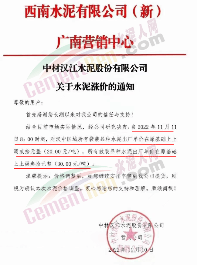 陜西省漢中市西南水泥廣南營銷中心中材漢江水泥通知結合目前市場實際情況,經公司研究決定自11月11日8時起,對漢中區(qū)域所有袋裝品種水泥出廠單價上調20元/噸。所有散裝品種水泥出廠價上調30元/噸。