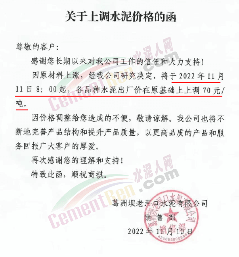 湖北省老河口市洪山咀葛洲壩老河口水泥有限公司通知,因原材料上漲,經公司研究決定于11月11日8時起,各品種水泥出廠價上調70元/噸。
