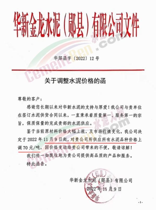 同期,湖北省十堰市華新金龍水泥(鄖縣)有限公司通知于11月9日起上調水泥價格70元/噸。