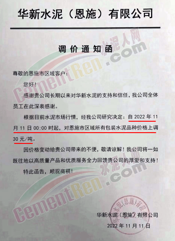 湖北省恩施土家族苗族自治州恩施市華新水泥(恩施)有限公司通知,根據當前水泥市場行情經公司研究決定,自11月11日0時起,對恩施區(qū)域所有包裝水泥價格上調30元/噸。