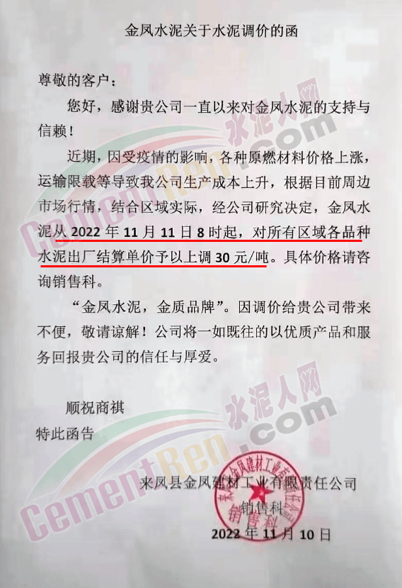 湖北省恩施土家族苗族自治州來鳳縣金鳳建材工業(yè)有限責任公司通知,因受疫情的影響,各種原燃材料價格上漲,運輸限載等導致公司生產成本上升,根據目前周邊市場行情 ,結合區(qū)域實際,經公司研究決定金鳳水泥從11月11日8時起,對所有區(qū)域各品種水泥出廠價上調30元/噸。