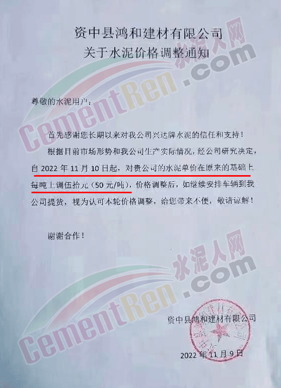 四川省內江市資中縣鴻和建材有限公司通知,根據目前市場形勢和公司生產實際情況,經公司研究決定,自11月10日起水泥價格上調50元/噸。