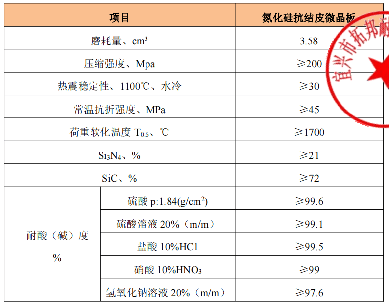 從以上數(shù)據(jù)可以看出,氮化硅微晶板具有高抗磨、高強度、耐侵蝕、抗結(jié)皮等性能,可廣泛使用于水泥窯煙室、五級下料管等易結(jié)皮、須耐磨部位。