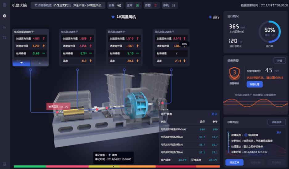 系統(tǒng)平臺解決了維修人員經(jīng)驗(yàn)不足、每次處理故障及產(chǎn)線停機(jī)維修間隔時(shí)間過長的問題。平臺系統(tǒng)內(nèi)置了故障算法模型,讓故障診斷分析自動化、智能化。此模型建立在對水泥工藝流程設(shè)備機(jī)理的理解基礎(chǔ)上,常規(guī)故障系統(tǒng)自診斷,并自動生成診斷報(bào)告,作為設(shè)備管理人員輔助診斷分析管理工具,大大提高了設(shè)備維修的工作效率,復(fù)雜故障由系統(tǒng)平臺的智能診斷和遠(yuǎn)程專家診斷,雙診斷模式,有力保障設(shè)備維修效率,定位設(shè)備故障部位及嚴(yán)重程度,減少了設(shè)備維修的時(shí)間,從而縮短設(shè)備停機(jī)時(shí)間,最大化減少因設(shè)備停機(jī)對生產(chǎn)任務(wù)的影響。
