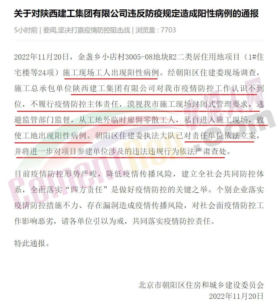11月20日,據(jù)北京市朝陽區(qū)住建委通報(bào),2022年11月20日,金盞鄉(xiāng)小店村3005-08地塊R2二類居住用地項(xiàng)目(1#住宅樓等24項(xiàng))施工現(xiàn)場工人出現(xiàn)陽性病例。經(jīng)朝陽區(qū)住建委現(xiàn)場調(diào)查,施工總承包單位陜西建工集團(tuán)有限公司對(duì)北京市疫情防控工作認(rèn)識(shí)不到位,不履行疫情防控主體責(zé)任,漠視北京市施工現(xiàn)場封閉式管理要求,逃避監(jiān)管部門監(jiān)督,從工地外臨時(shí)雇傭零散工人,私自進(jìn)入施工現(xiàn)場,致使工地出現(xiàn)陽性病例。朝陽區(qū)住建委執(zhí)法大隊(duì)已對(duì)責(zé)任單位依法立案,并將進(jìn)一步對(duì)項(xiàng)目參建單位涉及的違法違規(guī)行為依法嚴(yán)肅查處。