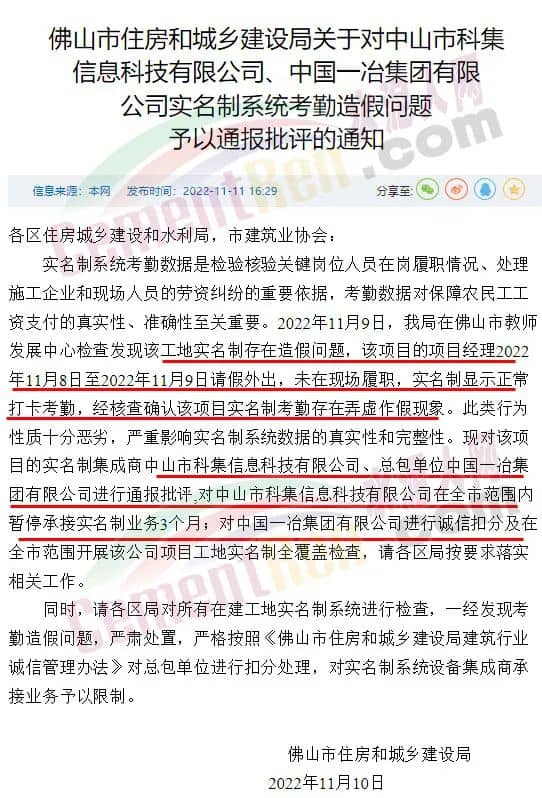 佛山市住建局11月10日通報(bào)稱,2022年11月9日,在佛山市教師發(fā)展中心檢查發(fā)現(xiàn)該工地實(shí)名制存在造假問題,該項(xiàng)目的項(xiàng)目經(jīng)理2022年11月8日至2022年11月9日請假外出,未在現(xiàn)場履職,實(shí)名制顯示正常打卡考勤,經(jīng)核查確認(rèn)該項(xiàng)目實(shí)名制考勤存在弄虛作假現(xiàn)象。