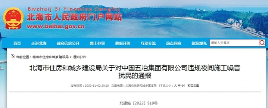 廣西北海市住建局通報(bào)中國五冶集團(tuán)有限公司違規(guī)夜間施工噪音擾民