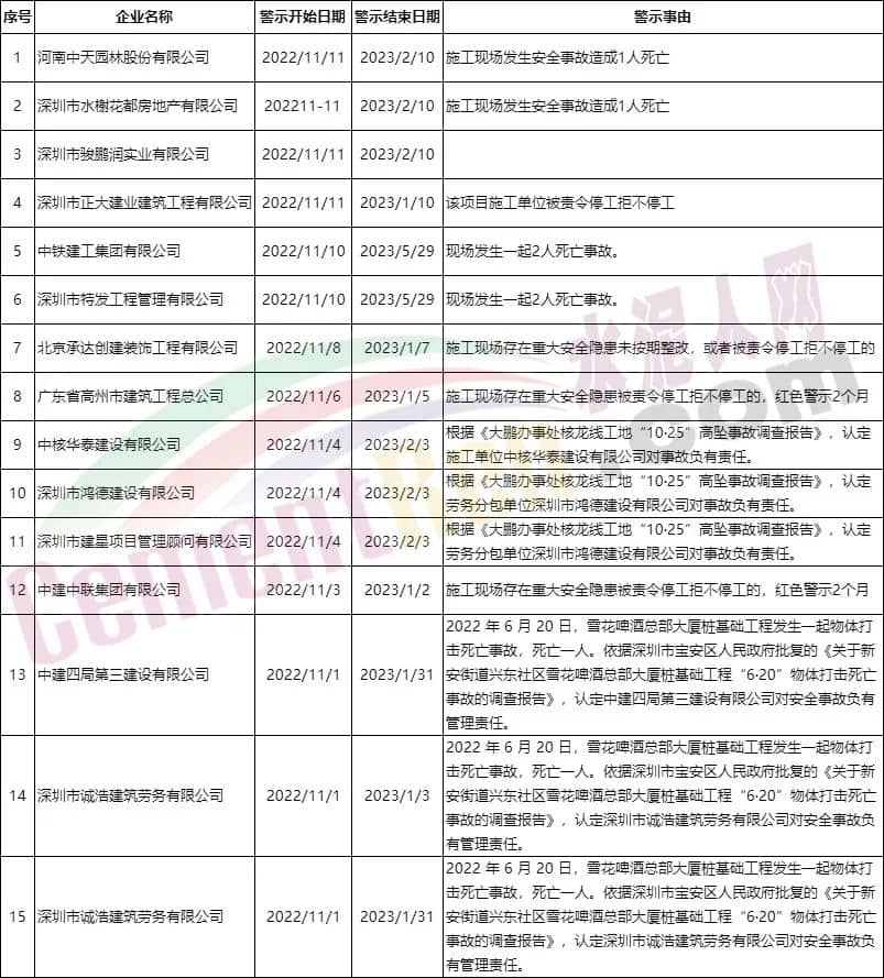 據(jù)查詢,11月1日至今,深圳市住建部門通報(bào)實(shí)施紅色警示的企業(yè)共有包括中鐵建、中建中聯(lián)、中建四局等建筑企業(yè)在內(nèi)的15家企業(yè),警示結(jié)束日期為2023年1月~5月。