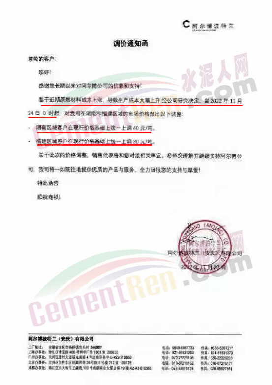 阿爾博波特蘭(安慶)有限公司通知,鑒于近期原燃材料成本上漲,導致生產(chǎn)成本大幅上升經(jīng)公司研究決定,自11月24日0時起,湖南區(qū)域在現(xiàn)行價格基礎(chǔ)上統(tǒng)一上調(diào)40元/噸。福建區(qū)域在現(xiàn)行價格基礎(chǔ)上統(tǒng)一上調(diào)30元/噸。
