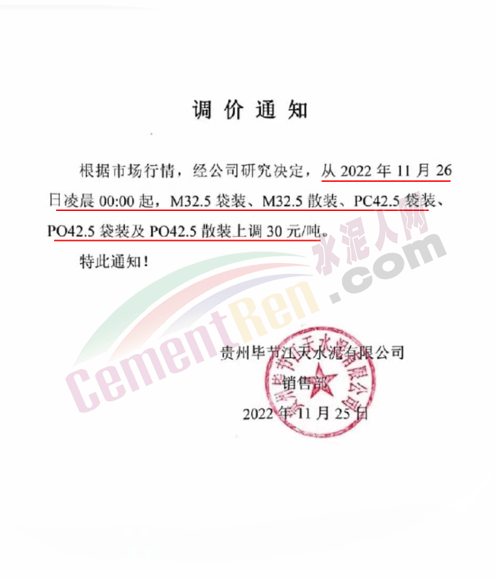 貴州畢節(jié)江天水泥有限公司通知從11月26日凌晨0時起,各標號水泥上調(diào)30元/噸。