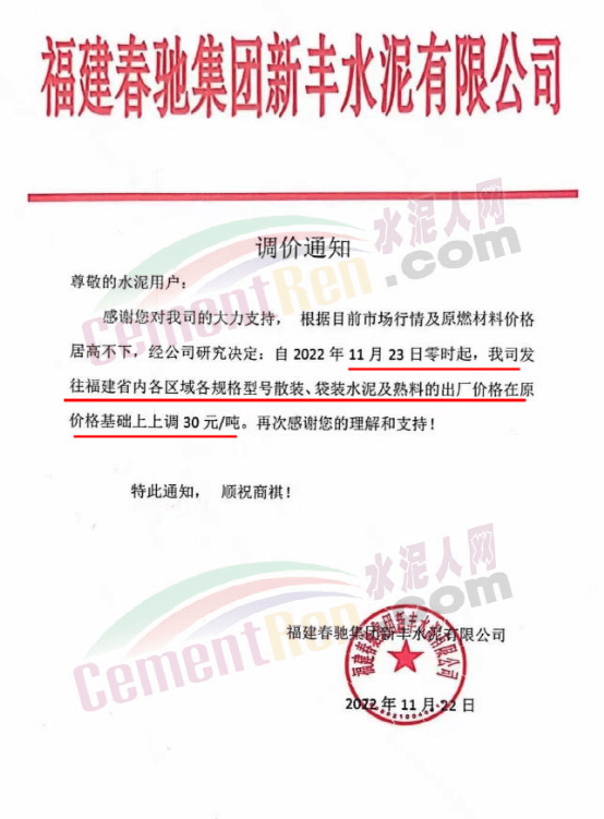 同期,福建春馳集團新豐水泥通知根據(jù)目前市場行情 及原燃材料價格居高不下,經(jīng)公司研究決定,自11月23日0時起公司發(fā)往福建省各區(qū)域各規(guī)格型號水泥及熟料出廠價在原基礎(chǔ)上上調(diào)30元/噸。