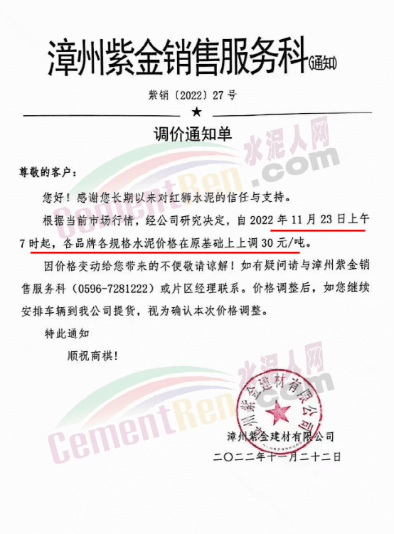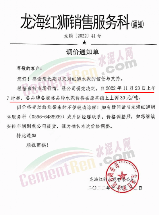 漳州紫金建材、龍海紅獅水泥通知,根據(jù)當前市場行情,經(jīng)公司研究決定,自11月23日上午7時起,各品種各規(guī)格水泥價格在原基礎(chǔ)上上調(diào)30元/噸。