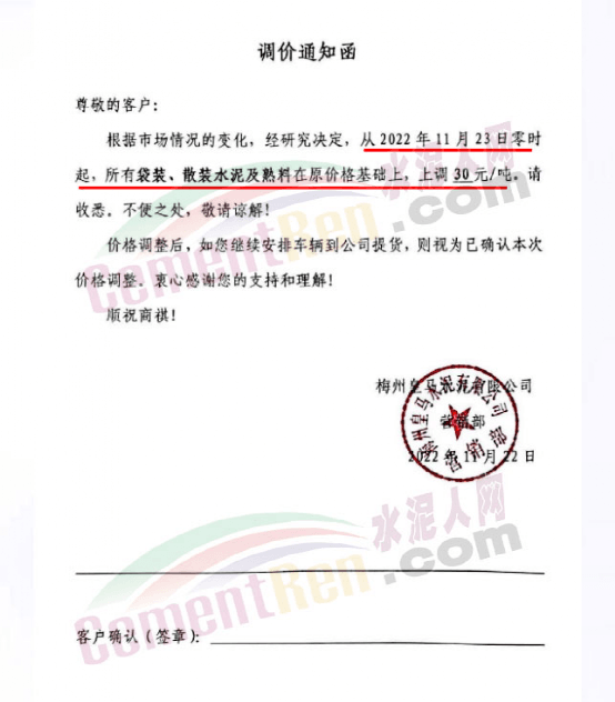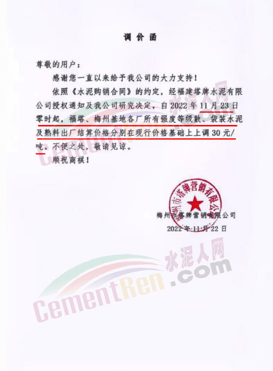 梅州市塔牌營銷有限公司通知自11月23日零時起,福塔、梅州基地各廠所有強度等級水泥及熟料出廠結(jié)算價分別在現(xiàn)行價格基礎(chǔ)上上調(diào)30元/噸。