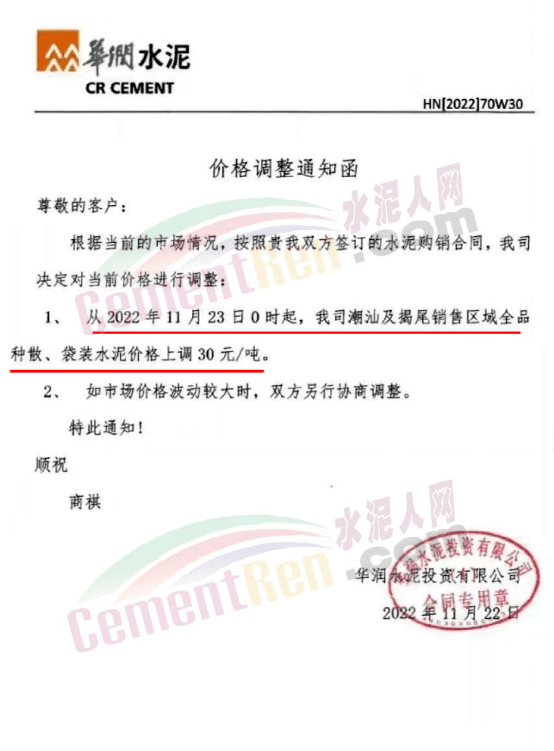 華潤水泥投資有限公司通知自11月23日0時起,公司潮汕及揭尾銷售區(qū)域全品種水泥上調(diào)30元/噸。