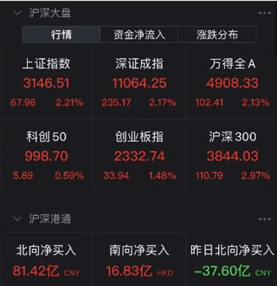 截至上午收盤,上證指數上漲2.21%,深證成指上漲2.17%,創(chuàng)業(yè)板指上漲1.48%。北向資金凈流入81.42億元。港股也暴漲,恒生科技指數上午收盤大漲5.45%,重回3600點,恒指、國指分別漲3.85%和4.72%。富時A50期指盤中漲超4%。