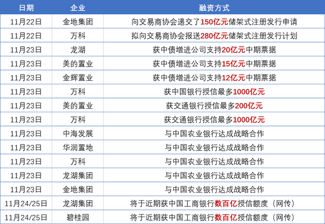 11月23日,中國銀行、農業(yè)銀行和交通銀行先后宣布與房企簽署戰(zhàn)略合作協(xié)議,給予房企授信額度。其中,交行率先給予萬科、美的置業(yè)分別1000億、200億授信;中國銀行給萬科1000億授信;中國農業(yè)銀行則一口氣與中海發(fā)展、華潤置地、萬科集團、龍湖集團、金地集團五家房企舉行了戰(zhàn)略合作協(xié)議簽約儀式。