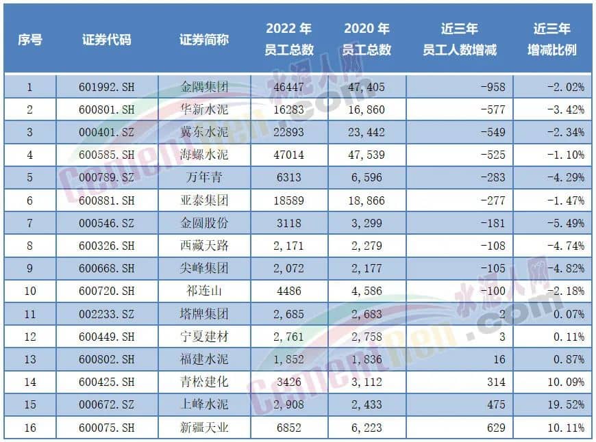 從近三年水泥行業(yè)16家上市公司員工增減數(shù)據(jù)可見,金隅集團(tuán)、華新水泥、冀東水泥、海螺水泥等10家企業(yè)超員100人及以上,其中金隅集團(tuán)減員958人,華新、冀東、海螺減員500人以上。