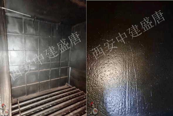2020年7月,西安中建盛唐首先對水泥廠的二線窯尾收塵器內壁腐蝕部位使用TD104#石墨烯防腐涂料進行防腐施工。在使用3個多月后,對窯尾袋收塵氣室運行情況進行檢查,效果良好:檢查 10 個凈氣室5個面防腐涂料防腐效果良好,完整無腐蝕脫落現(xiàn)象;10個凈氣室東、西側及頂部三個面結晶現(xiàn)象較嚴重,清理結晶物后,防腐層完整,未滲透防腐涂料,防腐效果良好。