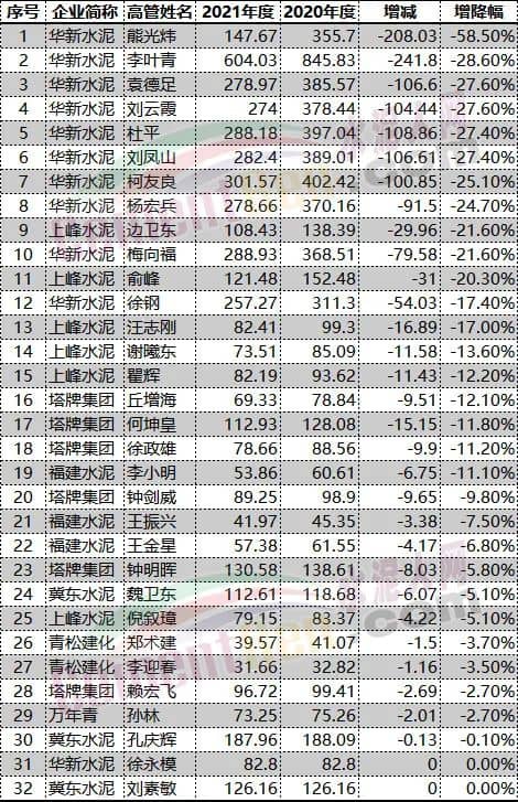 上市公司2021年財(cái)報(bào)顯示,水泥行業(yè)年薪過百萬的75位水泥上市公司高管中有30位薪酬下降,占比達(dá)40%。華新水泥、上峰水泥、塔牌集團(tuán)、福建水泥、冀東水泥部分高管薪酬較2020年有所減少,其中華新水泥7位高管薪酬均有100萬元以上的減少。