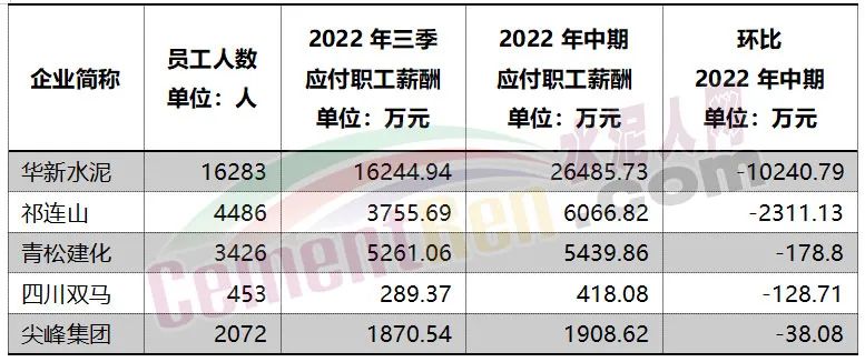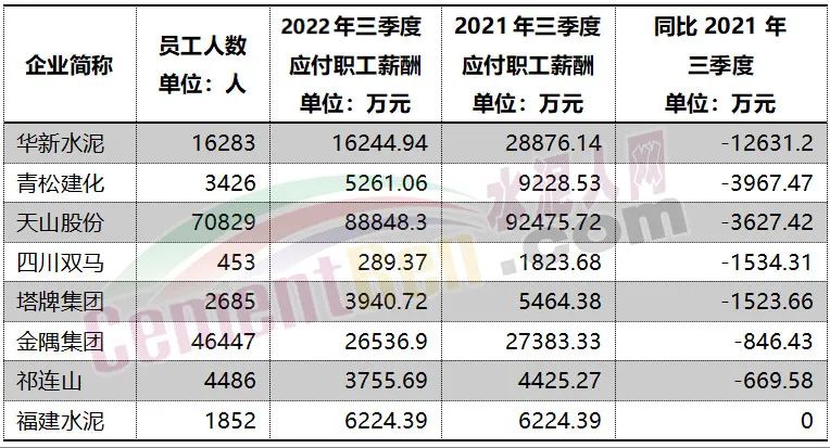 從上市公司三季度應(yīng)付職工薪酬可見,華新水泥、青松建化、天山股份、四川雙馬來、塔牌集團(tuán)、金隅集團(tuán)、祁連山等七家水泥企業(yè)應(yīng)付職工薪酬同比2021年三季度均有所下滑。其中華新水泥同比下滑約1.27億元。福建水泥應(yīng)付職工薪酬同比未增未減,考慮物價(jià)上漲因素,未增減也相當(dāng)于“降薪”。