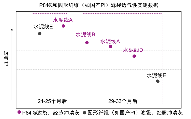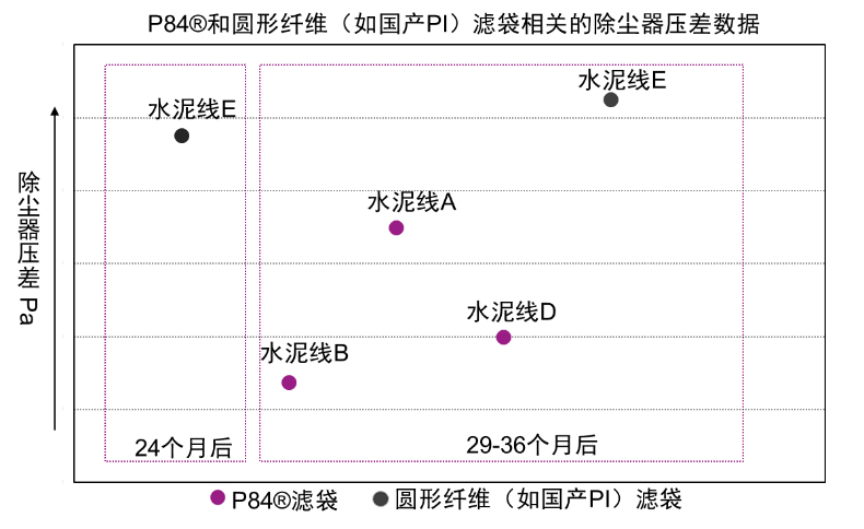 贏創(chuàng)集團(tuán)的P84®纖維團(tuán)隊(duì)基于多年走訪水泥廠收集的運(yùn)行案例,發(fā)現(xiàn)在水泥窯尾煙氣除塵的應(yīng)用中,比起行業(yè)內(nèi)其他濾袋,P84®濾袋的優(yōu)勢可以概括為以下三個方面: