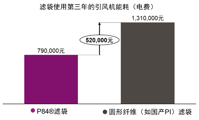 如圖10所示,安裝純P84®纖維濾袋的除塵器壓差更低,極大地降低引風(fēng)機(jī)的運(yùn)行能耗。某一實(shí)際案例中,在4年運(yùn)行周期內(nèi),預(yù)計(jì)可節(jié)約100萬元以上的電費(fèi)。