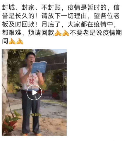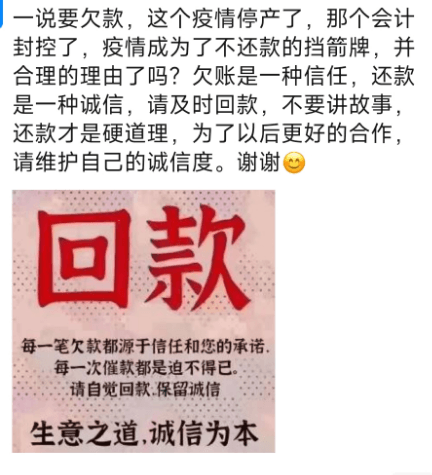 有網(wǎng)友表示,疫情成了不還款的擋箭牌。一說要欠款就說停產(chǎn)了,會計封控了。疫情是暫時的,信譽是長久的,大家都在疫情中,都很艱難。