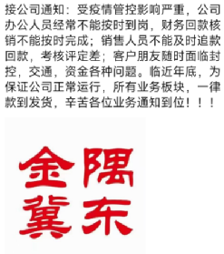 金隅冀東某公司因公司通知,受疫情影響,辦公室人員經(jīng)常不能按時到崗,財務(wù)回款核銷不能按照完成,銷售人員不能及時追款回款,考核評定差,客戶朋友又隨時面臨封控,交通,資金各種問題,臨近年底,為保證公司正常運行,所有業(yè)務(wù)板塊一律款到發(fā)貨。