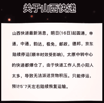 山西當(dāng)?shù)赝ㄖ?2月16日起,申通、圓通、中通、韻達(dá)、極兔快遞、郵政、德邦、京東等陸續(xù)停運(yùn)(順豐時(shí)效受影響),太原中轉(zhuǎn)中心快遞爆倉(cāng),無(wú)法派送,只能停運(yùn),預(yù)計(jì)5-7天左右陸續(xù)恢復(fù)運(yùn)輸。