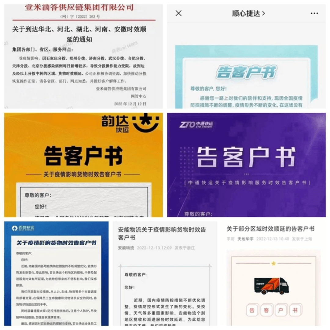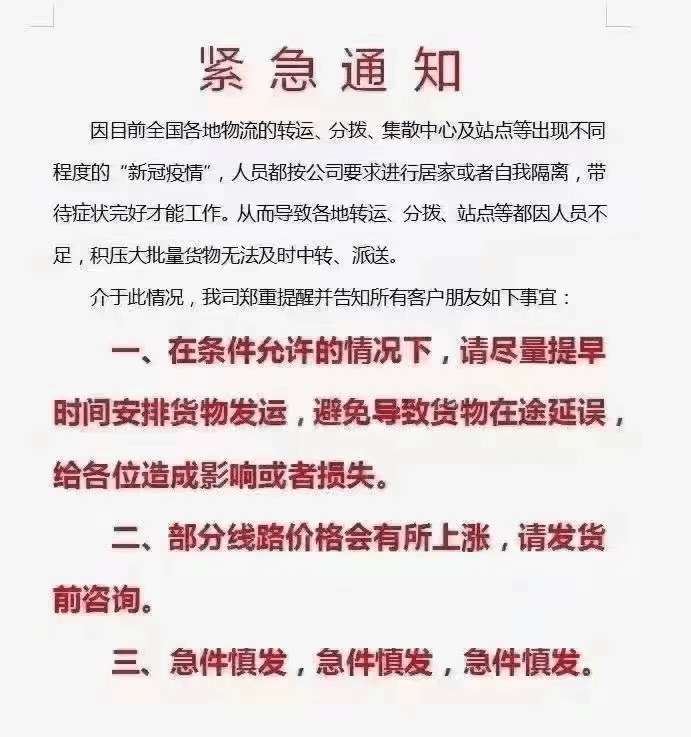 因疫情影響,順心捷達(dá)、安能物流、中通快運(yùn)、百世快運(yùn)、韻達(dá)快運(yùn)、壹米滴答、華宇物流等快運(yùn)公司相繼發(fā)布了告客戶書,告訴客戶受疫情影響比較嚴(yán)重,可能會(huì)出現(xiàn)送發(fā)貨不及時(shí)甚至部分地區(qū)不發(fā)貨情況。
