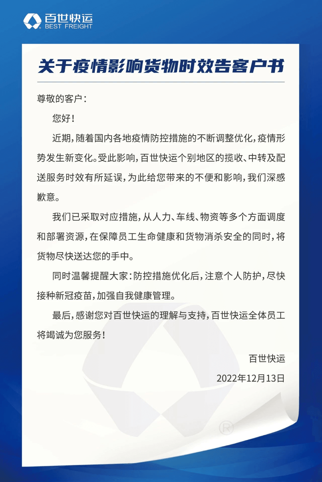 百世快運(yùn)表示,隨著國(guó)內(nèi)各地疫情防控措施的不斷調(diào)整優(yōu)化,疫情形勢(shì)發(fā)生新變化,受此影響,百世快運(yùn)個(gè)別地區(qū)的攬收、中轉(zhuǎn)及配送服務(wù)時(shí)效有所延誤。
