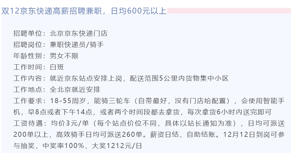 為解決北京“末端投遞”的問(wèn)題,京東物流在12月14日下午從全國(guó)調(diào)集的首批1000余名快遞小哥已陸續(xù)抵達(dá)北京,定向增援北京市內(nèi)的快遞配送等工作。他們于15日起陸續(xù)投入到北京全市的快遞配送工作中,后續(xù)還將有數(shù)百名小哥在本周內(nèi)抵京。