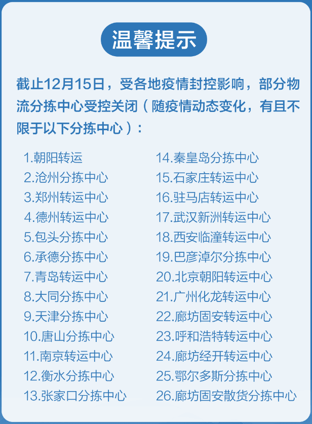 山東菏澤一企業(yè)溫馨提示稱:“因疫情全面放開(kāi),現(xiàn)多地物流分撥中心中轉(zhuǎn)場(chǎng)工作人員、送貨司機(jī)感染、發(fā)燒人員嚴(yán)重短缺,導(dǎo)致中轉(zhuǎn),送貨時(shí)效緩慢,請(qǐng)大家多多理解個(gè)年關(guān)將至,請(qǐng)?zhí)崆白龊脗湄浻?jì)劃!”