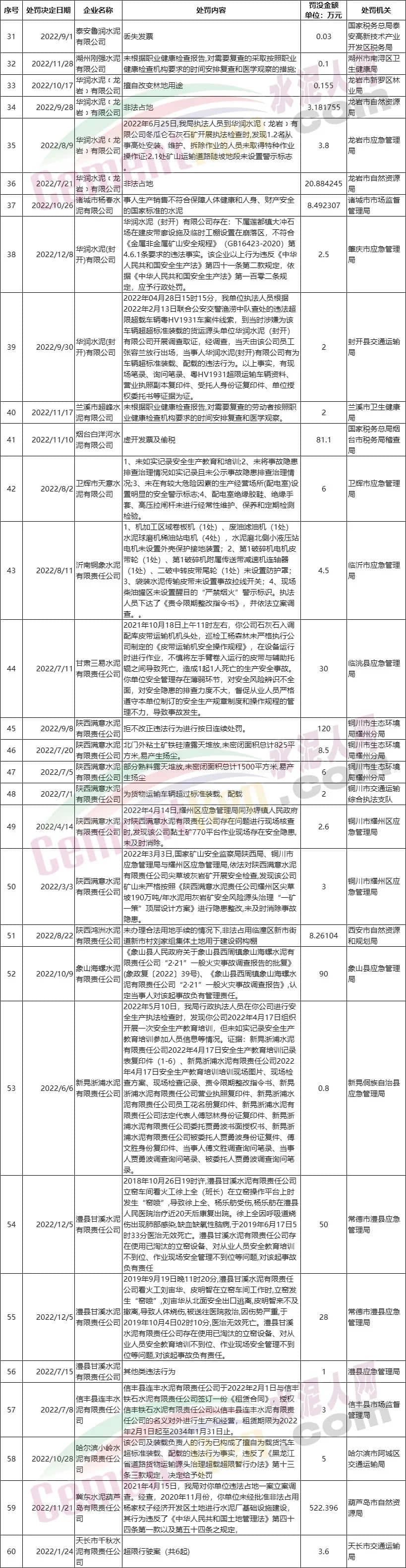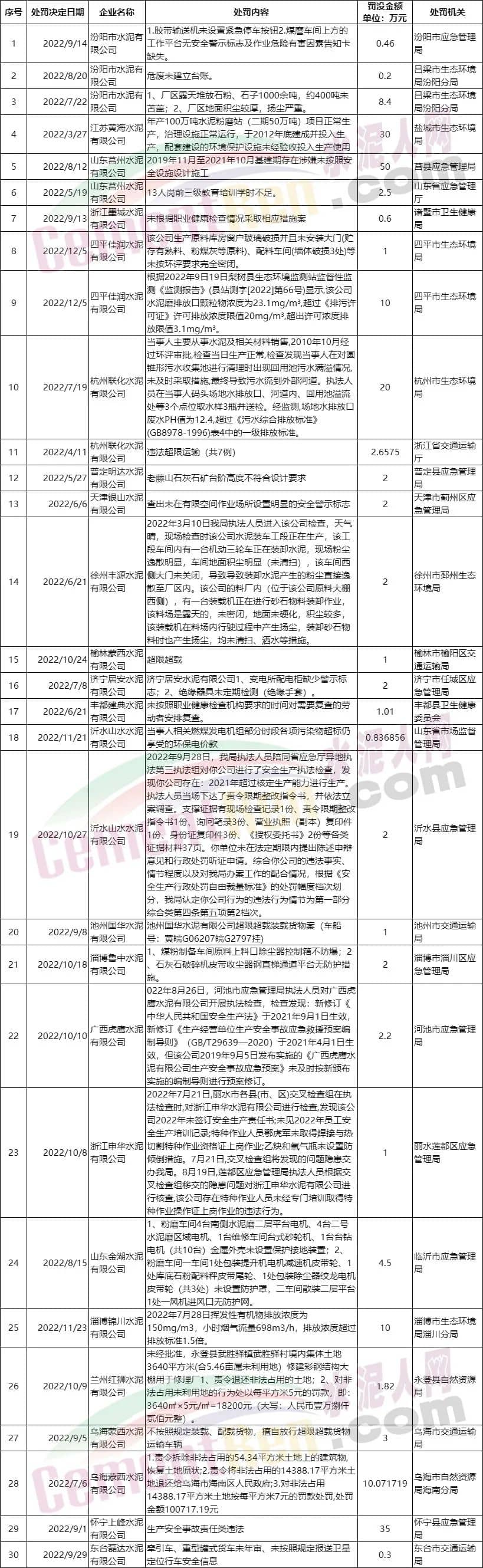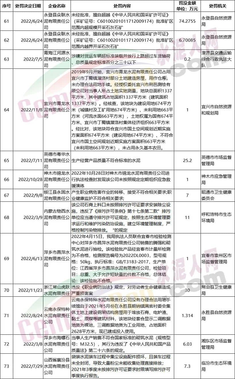 按照國務(wù)院安委會統(tǒng)一部署,從即日起至2023年全國“兩會”結(jié)束。同時(shí)各地生態(tài)環(huán)境、市場監(jiān)管、自然資源、交通運(yùn)輸、衛(wèi)生健康部門對于工貿(mào)領(lǐng)域的檢查也呈常態(tài)化。水泥人網(wǎng)特將年內(nèi)各區(qū)域公開處罰的部分水泥企業(yè)及相關(guān)處罰原因,匯總?cè)缦拢蕴嵝严嚓P(guān)企業(yè)引起重視。