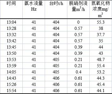 此前,江蘇某水泥有限公司一條設(shè)計(jì)產(chǎn)能4500t/d水泥生產(chǎn)線采用SNCR技術(shù)進(jìn)行脫硝處理,廠控氮氧化物排放指標(biāo)為50mg/ m3以內(nèi)。為確定南京永能無氨脫硝劑的效果,該公司在試驗(yàn)摻入中南京永能無氨脫硝劑,在氮氧化物排放穩(wěn)定后,加入稀釋后的脫硝劑,觀測(cè)窯尾氮氧化物排放數(shù)值,氨水用量,臺(tái)時(shí)產(chǎn)量,評(píng)判脫硝劑的使用效果。試驗(yàn)期間的數(shù)據(jù)如下表所示: