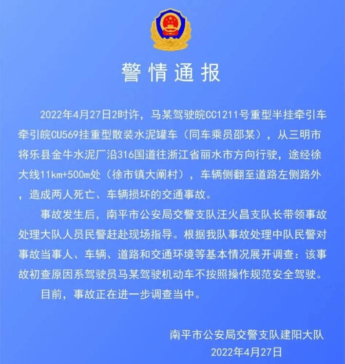 2022年4月27日2時許,馬某駕駛皖CC1211號重型半掛牽引車牽引皖CU569掛重型散裝水泥罐車(同車乘員邵某),從三明市將樂縣金牛水泥廠沿316國道往浙江省麗水市方向行駛,途經(jīng)徐大線11km+500m處(徐市鎮(zhèn)大闡村), 車輛側(cè)翻至道路左側(cè)路外造成兩人死亡、車輛損壞的交通事故。經(jīng)調(diào)查:該事故初查原因系駕駛員馬某駕駛機動車未按照操作規(guī)范安全駕駛。