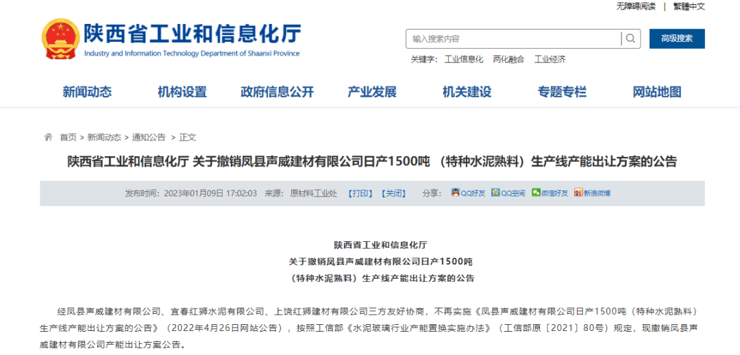 日前,陜西工信廳發(fā)布一則撤銷(xiāo)公告稱(chēng),經(jīng)鳳縣聲威建材有限公司、宜春紅獅水泥有限公司、上饒紅獅建材有限公司三方友好協(xié)商,不再實(shí)施《鳳縣聲威建材有限公司日產(chǎn)1500噸(特種水泥熟料)生產(chǎn)線產(chǎn)能出讓方案的公告》,按照工信部相關(guān)文件規(guī)定,撤銷(xiāo)鳳縣聲威建材有限公司產(chǎn)能出讓方案公告。