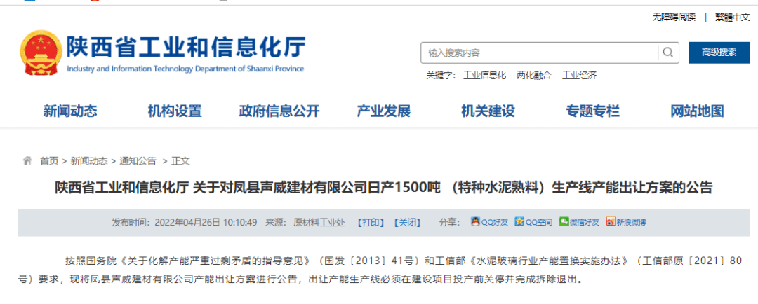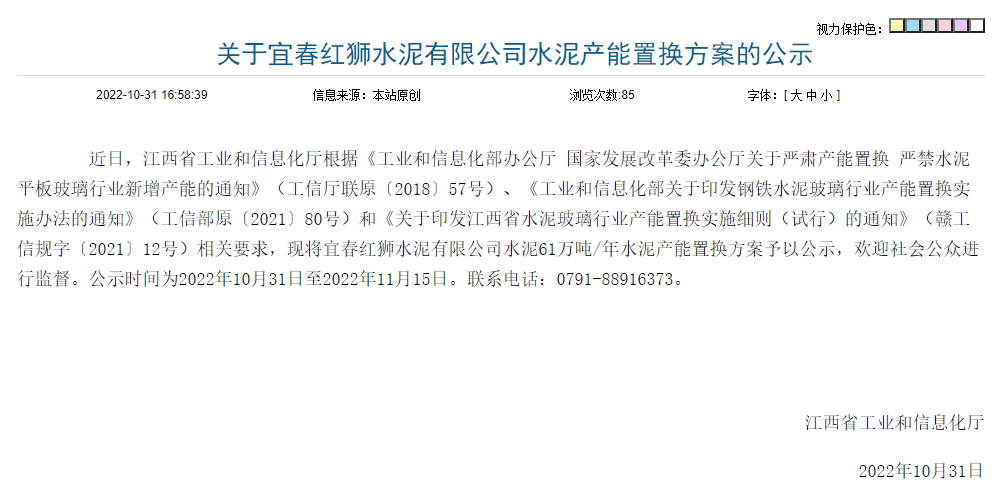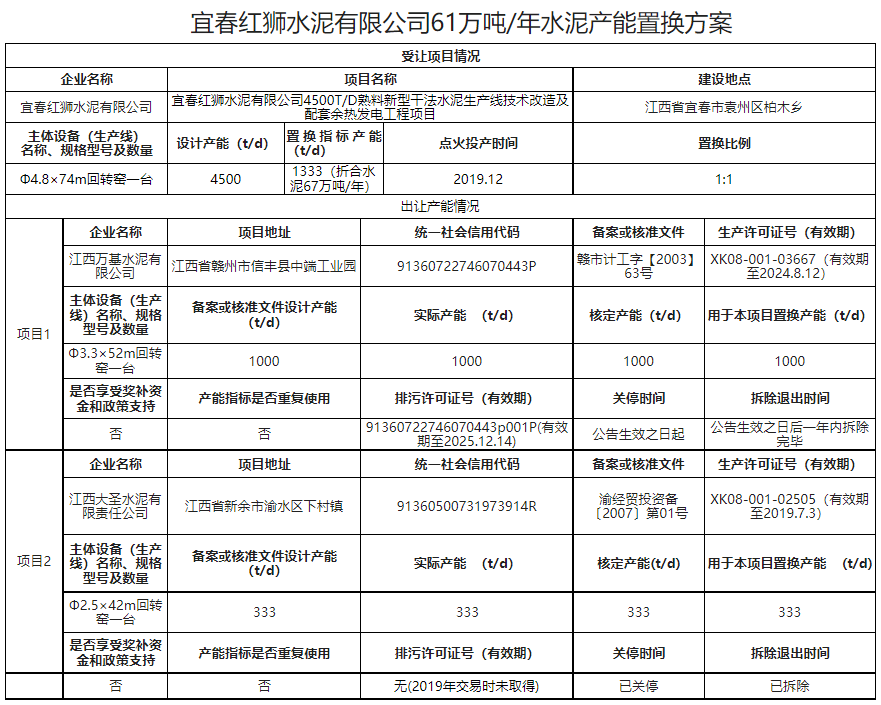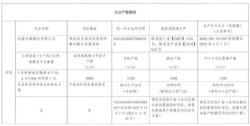 陜西省工信廳于2022年4月26日發(fā)布的鳳縣聲威建材有限公司1500t/d(特種水泥熟料)生產(chǎn)線出讓500t/d產(chǎn)能置換給宜春紅獅水泥有限公司,未出現(xiàn)江宜春紅獅熟料水泥生產(chǎn)線產(chǎn)能置換方案中。