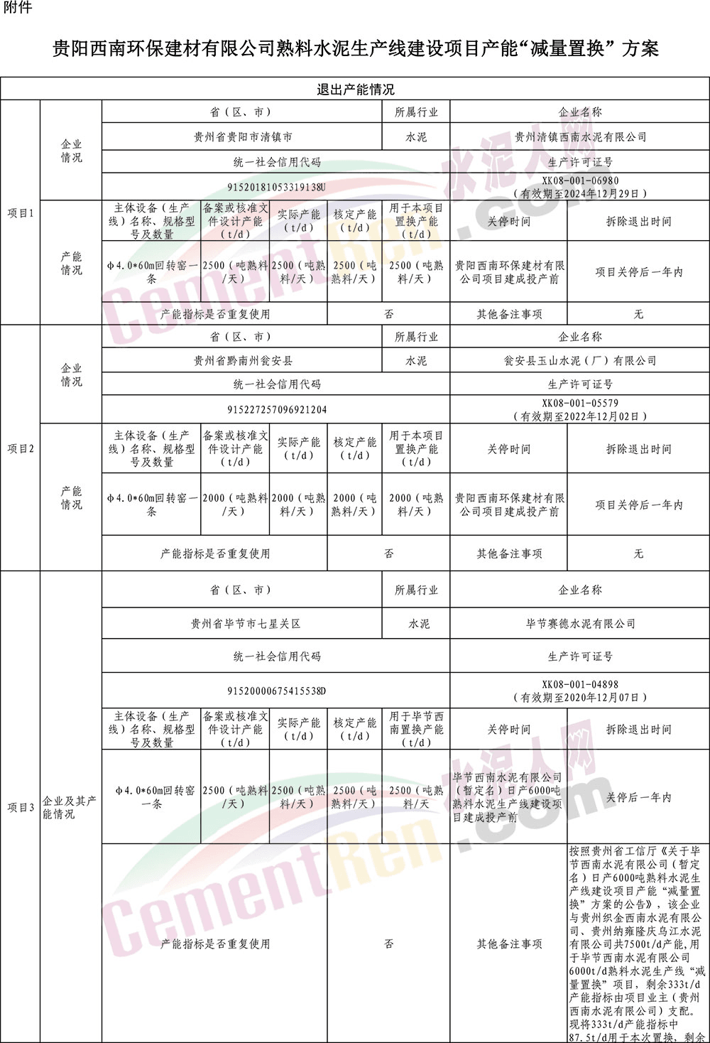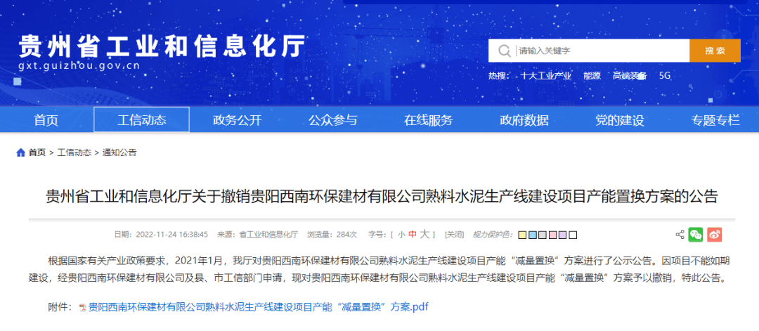 2022年11月份,貴州省工業(yè)和信息化廳發(fā)布《關(guān)于撤銷(xiāo)貴陽(yáng)西南環(huán)保建材有限公司熟料水泥生產(chǎn)線建設(shè)項(xiàng)目產(chǎn)能置換方案的公告》稱(chēng),根據(jù)國(guó)家有關(guān)產(chǎn)業(yè)政策要求,2021年1月,貴州省工信廳對(duì)貴陽(yáng)西南環(huán)保建材有限公司熟料水泥生產(chǎn)線建設(shè)項(xiàng)目產(chǎn)能“減量置換”方案進(jìn)行了公示公告。因項(xiàng)目不能如期建設(shè),經(jīng)貴陽(yáng)西南環(huán)保建材有限公司及縣、市工信部門(mén)申請(qǐng),對(duì)貴陽(yáng)西南環(huán)保建材有限公司熟料水泥生產(chǎn)線建設(shè)項(xiàng)目產(chǎn)能“減量置換”方案予以撤銷(xiāo)。
