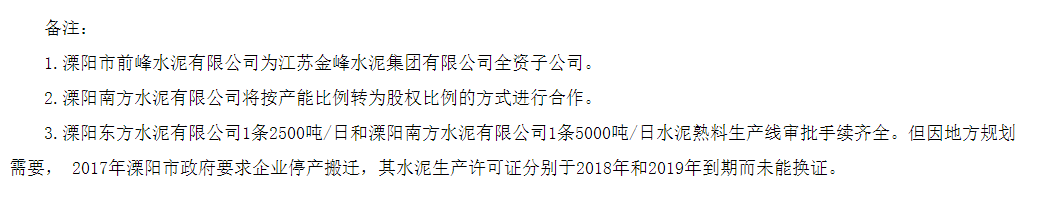方案?jìng)渥⒅刑峒?,溧?yáng)東方水泥有限公司1條2500噸/日和溧陽(yáng)南方水泥有限公司1條5000噸/日水泥熟料生產(chǎn)線審批手續(xù)齊全。但因地方規(guī)劃需要,2017年溧陽(yáng)市政府要求企業(yè)停產(chǎn)搬遷,其水泥生產(chǎn)許可證分別于2018年和2019年到期而未能換證。