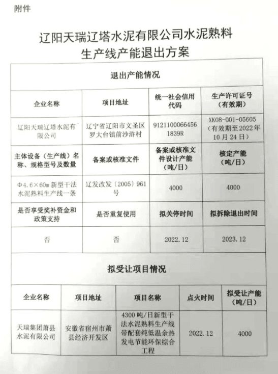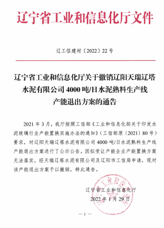 2022年1月30日,遼寧省工信廳發(fā)布關(guān)于撤銷(xiāo)遼陽(yáng)天瑞遼塔水泥有限公司4000噸/日水泥熟料生產(chǎn)線產(chǎn)能退出方案的通告稱(chēng),2021年3月,遼寧省工信廳按照工信部相關(guān)文件要求,對(duì)遼陽(yáng)天瑞遼塔水泥有限公司4000噸/日水泥熟料生產(chǎn)線產(chǎn)能退出方案進(jìn)行了公示公告。因擬受讓產(chǎn)能企業(yè)產(chǎn)能置換方案無(wú)法落實(shí),經(jīng)天瑞遼塔水泥有限公司及遼陽(yáng)市工信局申請(qǐng),對(duì)該產(chǎn)能退出方案予以撤銷(xiāo)。