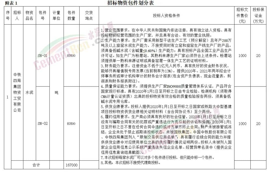注冊資金不低于1億元人民幣,具有良好的資金財務(wù)狀況,能夠開具增值稅專用發(fā)票(當(dāng)前稅率為13%)。投標人需提供2020年1月1日至開標之日國家或鐵路大中型基建項目投標物資供貨業(yè)績相關(guān)證明材料至少兩份。本次招標每家水泥廠可以對多個包件進行投標,但只能中標一個包件,本次招標不接受代理商投標。