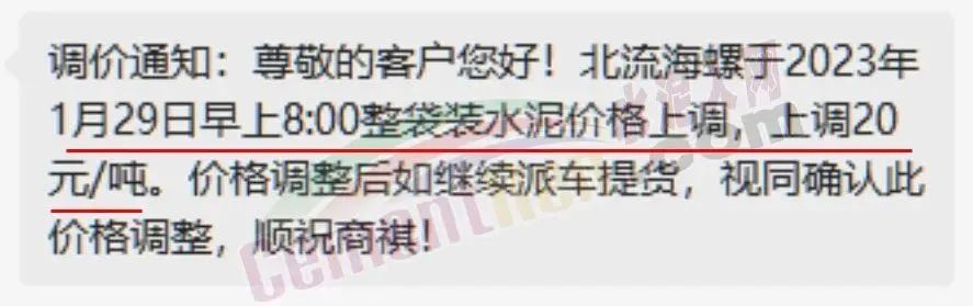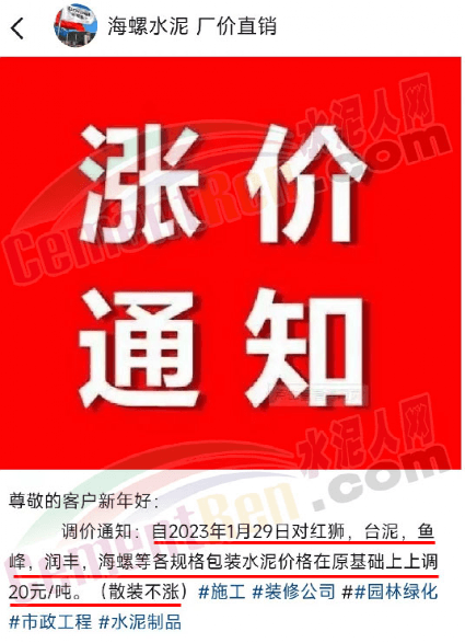 北流海螺水泥通知稱,于2023年1月29日早上8時(shí)起袋裝水泥價(jià)格上調(diào),上調(diào)20元/噸。