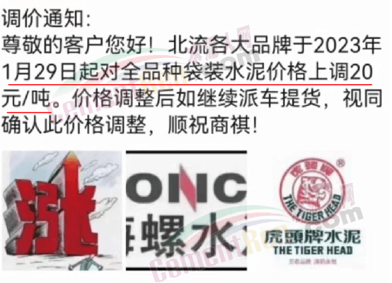 南寧區(qū)域水泥經(jīng)銷商發(fā)調(diào)價(jià)通知稱,自2023年1月29日對紅獅、臺泥、魚峰、潤豐、海螺等各規(guī)格包裝水泥價(jià)格在原基礎(chǔ)上上調(diào)20元/噸,同時(shí)提示散裝水泥不漲價(jià)。