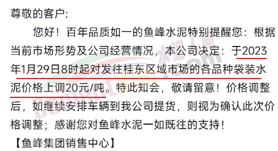 魚峰集團(tuán)銷售中心通知稱,根據(jù)當(dāng)前市場形勢及公司經(jīng)營情況,公司決定于2023年1月29日8時(shí)起對發(fā)往桂東區(qū)域市場的各品種袋裝水泥價(jià)格上調(diào)20元/噸。