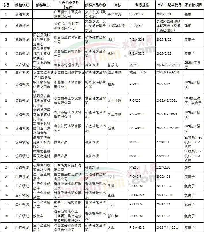 近日,多地區(qū)通報(bào)了水泥抽檢質(zhì)量不合格的消息,在19個(gè)批次不合格品中,有10個(gè)批次水泥強(qiáng)度不合格。