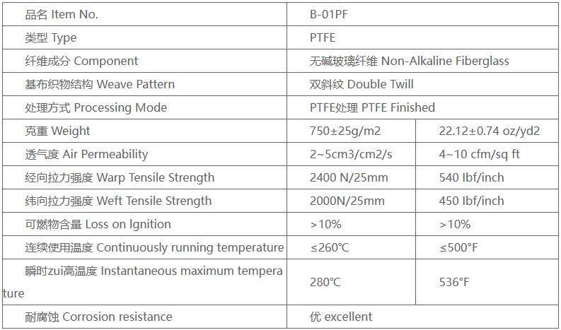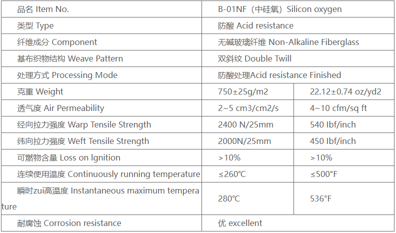 B-01NF玻纖濾料具有優(yōu)良的耐熱性,可在260°以下長期使用;機(jī)械強(qiáng)度高、伸縮率小。斷裂強(qiáng)度一般在1300N以上,使用其制作的濾袋具有足夠的抗拉強(qiáng)度和尺寸穩(wěn)定性;同時具有優(yōu)良的耐腐蝕性能,在酸、堿氣體中均可以使用;表面光滑、透氣性好、過濾阻力小,有利于粉塵剝離。