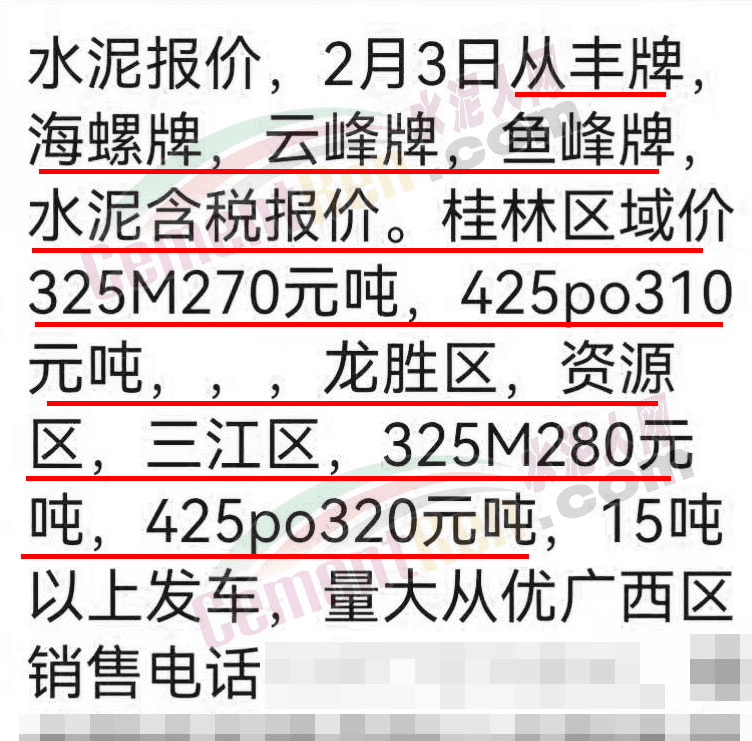 據(jù)市場(chǎng)反饋,華南區(qū)域節(jié)后第一波價(jià)格上調(diào)是從廣西區(qū)域開(kāi)始的。廣西桂林一經(jīng)銷(xiāo)商通知稱(chēng),2月3日從豐牌、海螺牌、云峰牌、魚(yú)峰牌水泥含稅報(bào)價(jià),桂林區(qū)域M32.5水泥270元/噸,P.O42.5水泥報(bào)價(jià)310元/噸。龍勝區(qū)、資源區(qū)、三江區(qū)M32.5水泥報(bào)價(jià)280元/噸,P.O42.5水泥報(bào)價(jià)320元/噸,15噸以上發(fā)車(chē),量大從優(yōu)。